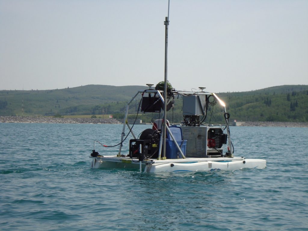 An example of the fusion between sensor design and other projects. This thermally stabilized 256 cu.in. NaI(Tl) scintillometer detector is deployed through pre-drilled ice auger holes by a small tracked survey vehicle equipped with and electric winch.